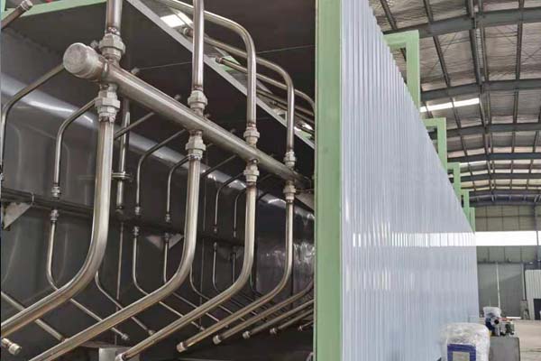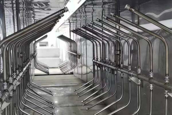 前處理生產線結構特點是:前處理生產線各工序噴淋管布置在隧道內,噴淋由各液槽的泵來提供.各工序間都有門洞板隔開,以防竄液.各加熱液槽的加熱形式有槽內和槽外。內加熱器有排管、蛇形管、波紋板等;外加熱器有列管、板式加熱器等。加熱介質有熱水 、蒸汽、導熱油等。在脫脂、磷化工序分別設有除油系統和除渣系統。為防止各加熱段隧道頂部及門洞處溢出蒸汽,在隧道頂部設有排風機。